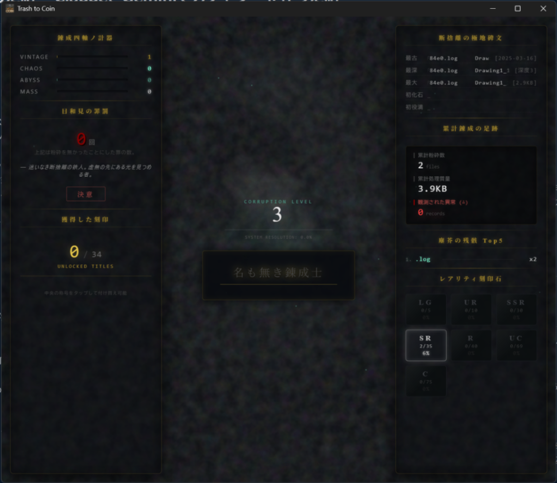 UIの「発散」はGeminiが圧倒的に得意でした。「ダーク・ミスティックなステータス画面を作って」と投げると、CORRUPTION LEVEL という概念を勝手に追加してくれました。「断捨離するほどアバターの解像度が上がる」というメタ演出も発散中に生まれたアイデアです。