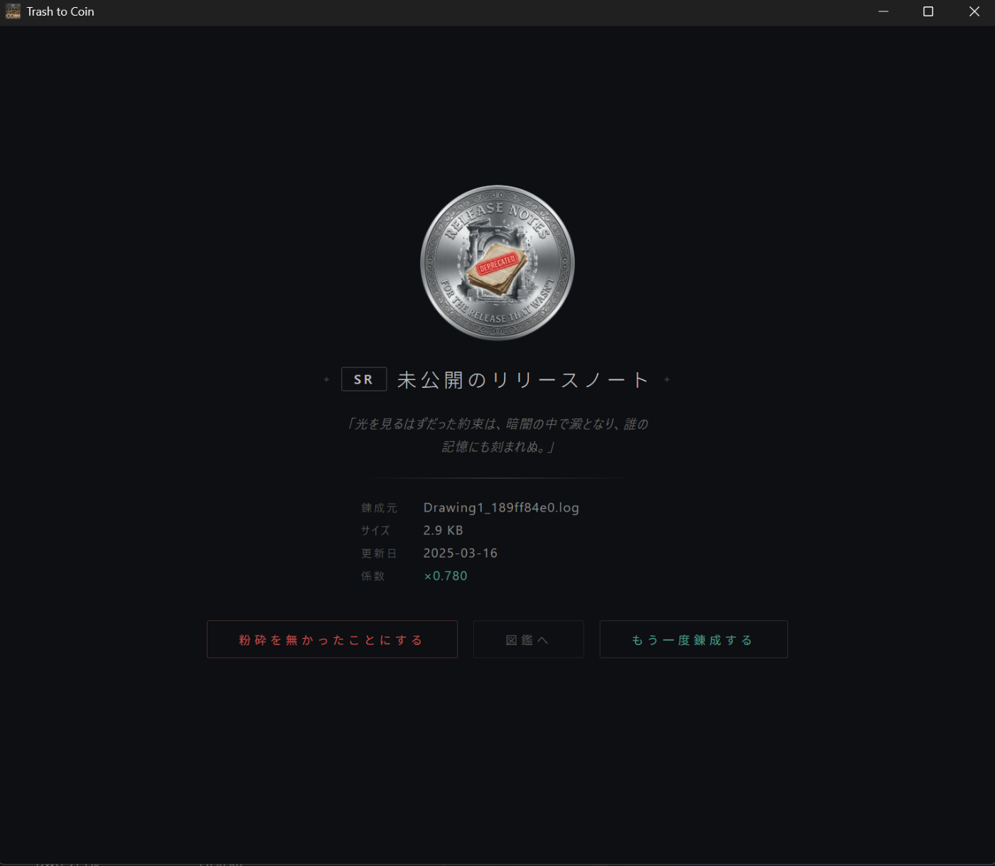 あ、Trash-to-Coinは完全無料(マジ)です。デスクトップに積もった「最終版_絶対_コピー(3).psd」(だから大げさなんよこのファイル名)を持っている方は、ぜひ炉に投げ込んでみてください。